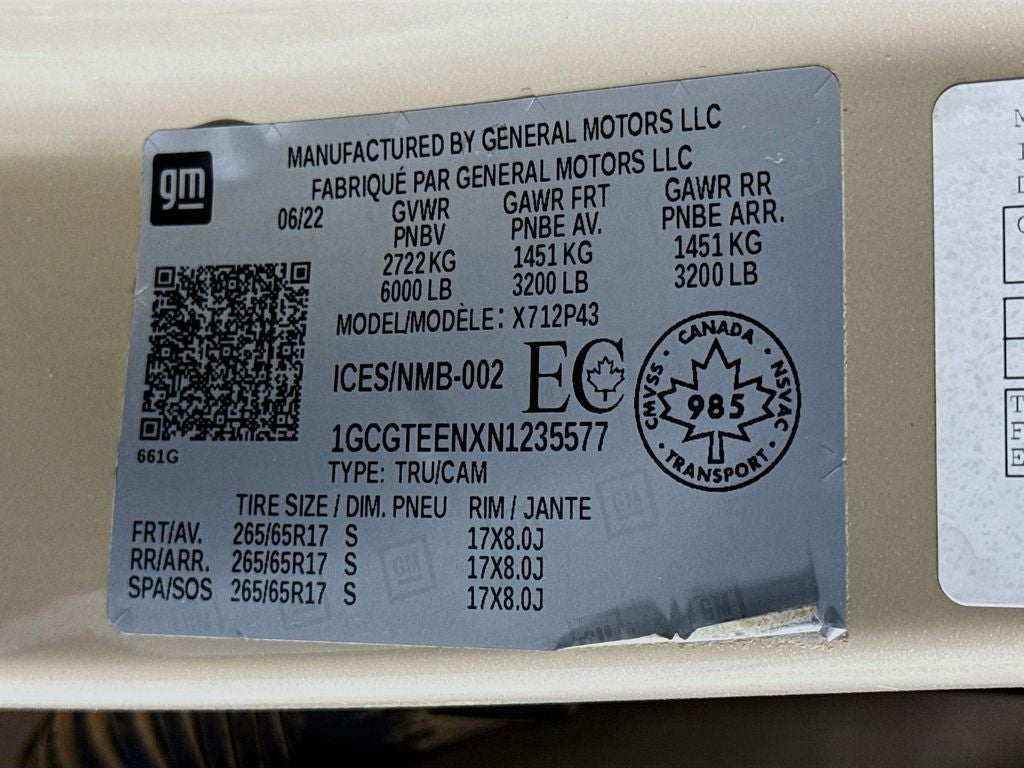 Preferred Equipment Group 4ZR: Driver-Selectable Full-Locking Front Differential; 265/65R17 AT BW Spare Tire; Hitch Guidance; Driver-Selectable Full-Locking Rear Differential; Leather-Appointed Seat Trim; Front Bucket Seats; Off-Road Rocker Protection; 3.42 Rear Axle Ratio; Black Spray-On Bed Liner with Chevrolet Logo; Transfer Case Shield; 17" X 8" Aluminum Spare Wheel; Integrated Trailer Brake Controller; 17" X 8" Graphite and Oxide Gold Aluminum Wheels; Black Rear Bumpers; Tow/haul Mode; 2-Speed Electric Transfer Case; Heavy-Duty Trailering Package; 265/65R17 AT BW Tires; 2. 722 Kgs (6. 000 Lbs) GVWR; Off-Road Appearance Package; 3.6L DI DOHC V6 VVT Engine. Chevrolet Infotainment 3 Plus System Radio with Navigation. Sand Dune Metallic. Wireless Charging For Compatible Cell Phones. **Equipment listed is based on original vehicle build and subject to change. Please confirm the accuracy of the included equipment by calling the dealer prior to purchase.**
