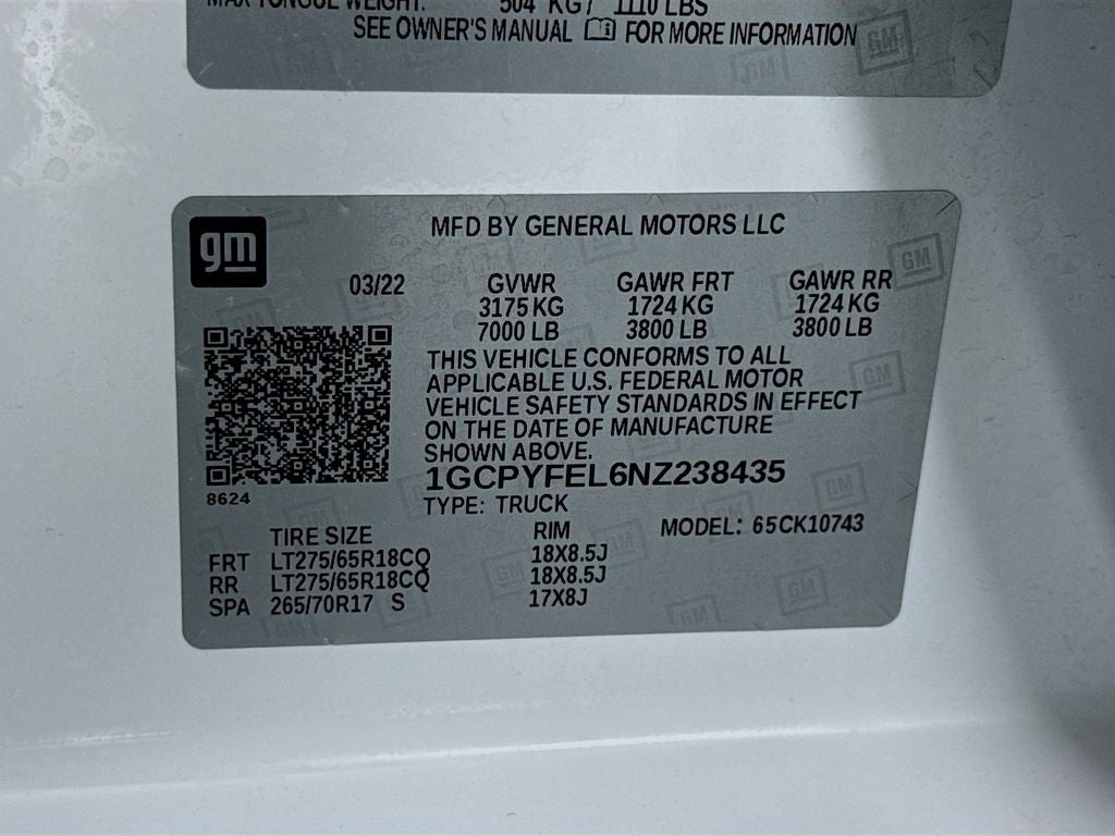 Safety Package: Perimeter Lighting; Ultrasonic Front and Rear Park Assist; Rear Cross Traffic Alert; Lane Change Alert with Side Blind Zone Alert. Preferred Equipment Group 2LT: LED Cargo Area Lighting; Rear Vision Camera; Bluetooth® For Phone; Remote Vehicle Starter System; 2 USB Ports (first Row); Electric Rear-Window Defogger; Theft Deterrent System (unauthorized Entry); Auxiliary External Transmission Oil Cooler; LT275/65R18C MT BW Tires; Compass; 4.2" Diagonal Color Display Driver Info Center; Heated Steering Wheel; Trailering Package; Standard Tailgate; Front LED Fog Lamps; Heated Driver and Front Outboard Passenger Seats; Suspension Package; Steering Wheel Audio Controls; Color-Keyed Carpeting Floor Covering; OnStar and Chevrolet Connected Services Capable; Power Front Windows with Passenger Express Down; 2-Speed Transfer Case; Deep-Tinted Glass; All-Weather Floor Liner; High Gloss Black Mirror Caps; Dual Exhaust with Polished Outlets; Chevrolet Infotainment 3 System Radio; Electronic Cruise Control; Power Rear Windows with Express Down; Performance Red Recovery Hooks; Power Front Windows